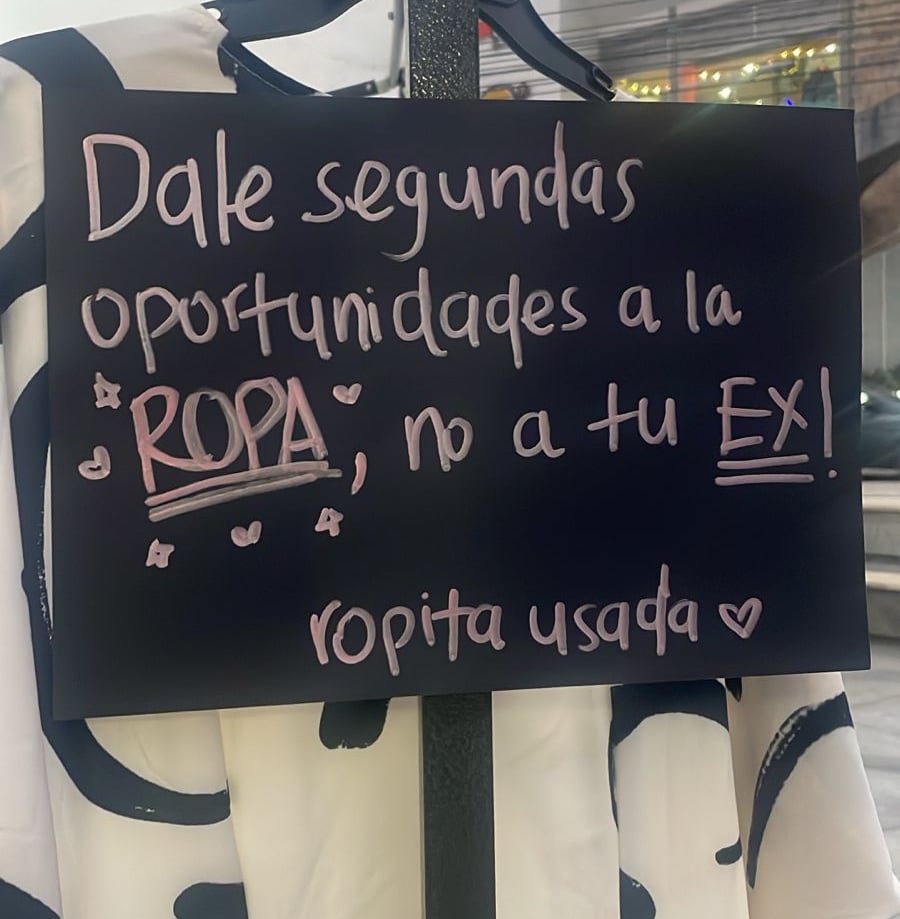 El segundo unas señoras que en la plazoleta de la facultad de arquitectura que estaban vendiendo Ropa Usada con una frase llamativa “Dale Segundas oportunidades a la ROPA, no a tu Ex” Ropita Usada”